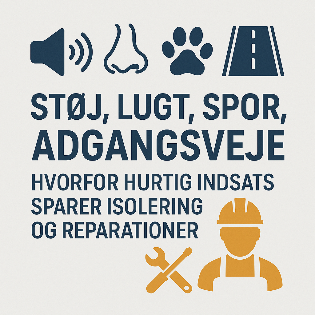 I skadesforebyggelse handler det om at opdage et problem, mens det stadig er lille. En enkel definition: Støj, lugt og spor er tidlige indikatorer på aktivitet i eller omkring husets konstruktion, ofte fra dyr, fugle, gnavere eller fugt, og de betyder noget, fordi de peger på både en kilde og en adgangsvej. Når du kobler signalerne sammen, kan du stoppe årsagen, før følgeskaderne spreder sig.